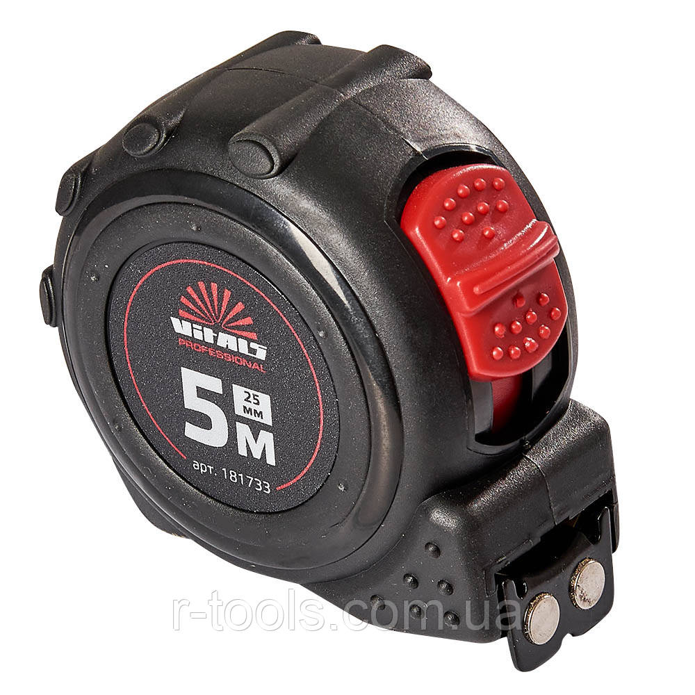 Вимірювальна рулетка прогумована з нейлоновим покриттям полотна 5 м × 25 мм Vitals Professional призначена для вимірювання довжини під час проведення будівельних або ремонтних робіт.